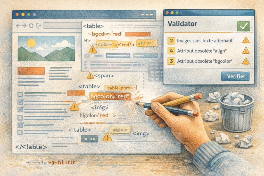 Ils naissent plutôt d’un empilement : un thème un peu approximatif, un plugin trop bavard, un bloc natif à reprendre, un shortcode ancien, un peu de HTML sale, quelques attributs hérités, et un historique technique qui s’est épaissi avec le temps.